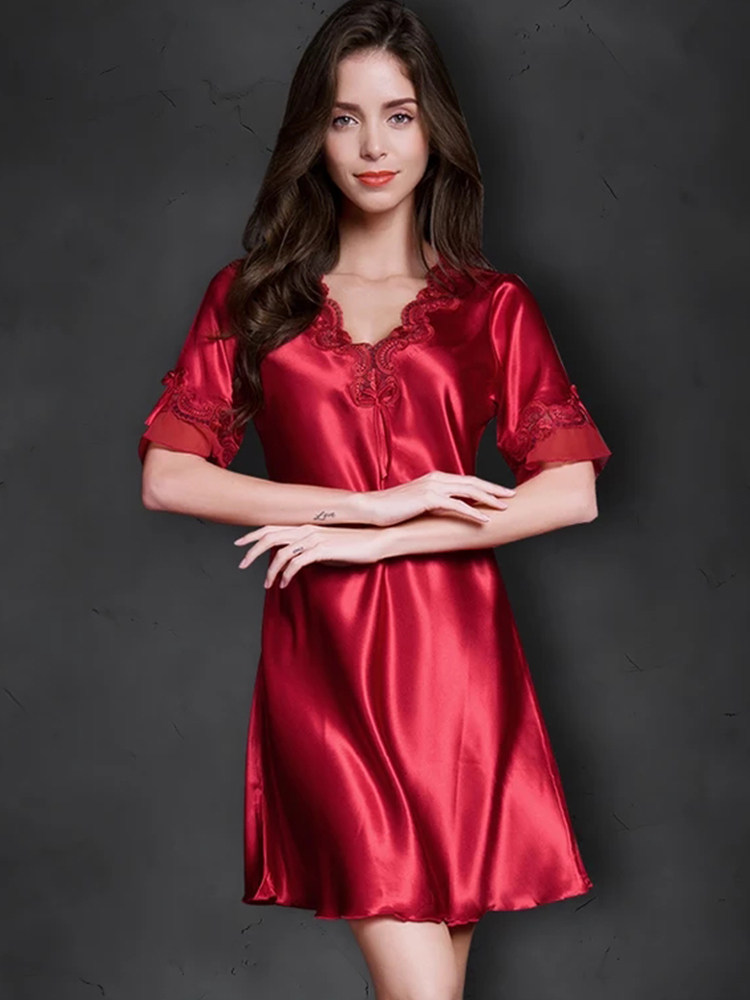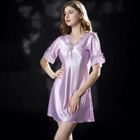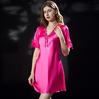 【冰絲緞面柔感睡裙】柔霧緞面睡裙 親膚絲滑觸感 V領蕾絲點綴 蝴蝶結細節添柔媚 居家盡顯優雅氣質