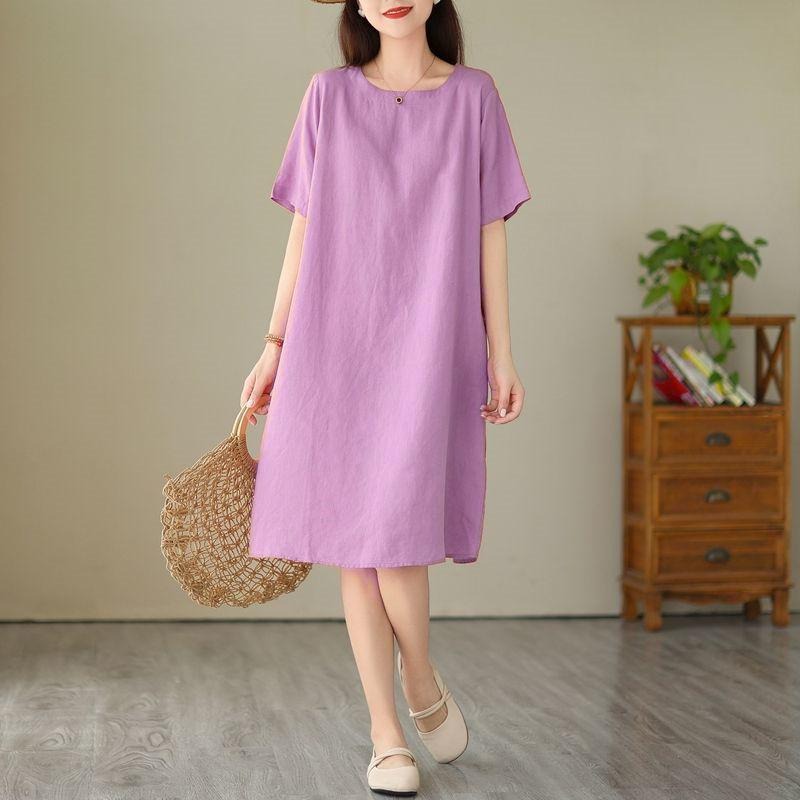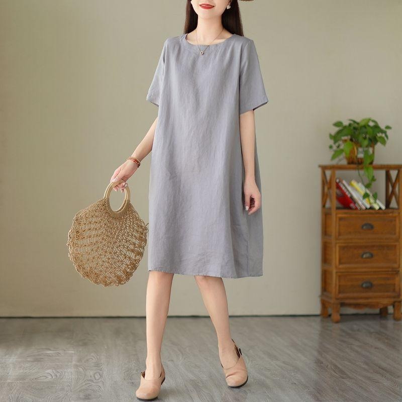 天然亞麻素色洋裝 寬鬆版型透氣舒適 簡約圓領設計百搭耐看 夏日穿著清爽又優雅
